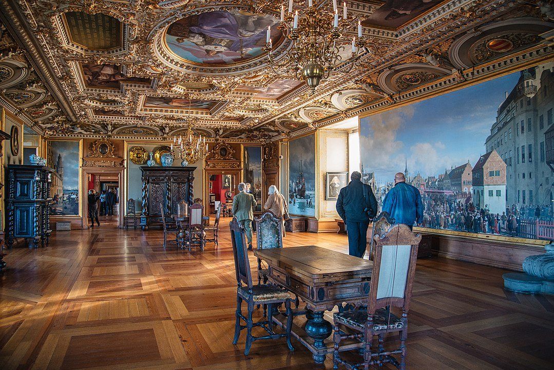 Der Teil des Schlosses, der beim Brand 1859 unversehrt blieb, wurde ins Museum integriert. Die zerstörten Räume wurden teilweise nahe am Original restauriert und so bietet sich uns heute noch der Anblick, den Theodor Fontane vor Augen hatte, als das er den Frederiksborger Teil seiner Erzählung schrieb. So könnte das gewaltige Gemälde einer Seeschlacht mit vielen dänischen Wimpeln durchaus das Gemälde sein, über das die Abendgesellschaft so intensiv diskutierte. Und in der üppig verzierten Schlosskirche ließ Fontane in der Nacht des Feuers die verängstigten und schockierten Schlossbewohner Zuflucht finden. Aber auch ohne Rückkoppelung mit dem Roman lohnt der Besuch dieses Nationalhistorischen Museums. Vergoldete Decken, prächtige Wandteppiche, erlesene Gemälde und wertvolle Möbel künden vom Reichtum vergangener Epochen und gehen in ihrer Qualität und Vielfalt über die Einrichtung eines einzelnen Schlosses weit hinaus. Außergewöhnlich ist die Abteilung „Historienmalerei“. Alte und neue Historiengemälde finden sich hier zusammen und immer wieder wird die Sammlung ergänzt. Teilweise durch Anschaffung von Werken vergangener Epochen, teilweise durch Aufträge an zeitgenössische Maler.